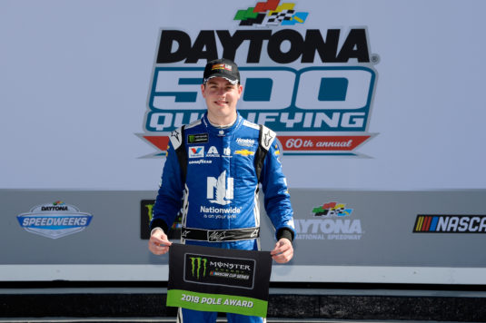 DAYTONA BEACH, FL – Alex Bowman, driver of the #88 Nationwide Chevrolet, poses for a photo after winning the Pole Award during qualifying for the Monster Energy NASCAR Cup Series Daytona 500 at Daytona International Speedway on February 11, 2018 in Daytona Beach, Florida. (Photo by Robert Laberge/Getty Images)