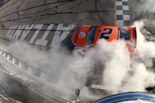 HAMPTON, GA – Brad Keselowski, driver of the #2 Autotrader Ford, celebrates with a burnout after winning the Monster Energy NASCAR Cup Series Folds of Honor QuikTrip 500 at Atlanta Motor Speedway on February 24, 2019 in Hampton, Georgia. (Photo by Sean Gardner/Getty Images)